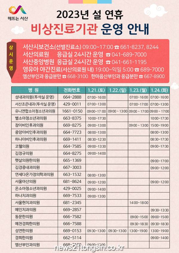 충남 서산시가 설날 연휴 기간인 오는 21일부터 24일까지 진료 공백 해소를 통한 시민 불편 최소화와 응급환자 발생 대비를 위해 응급진료체계를 가동한다.