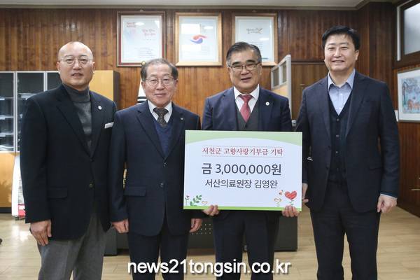 ▲ 김영완 서산의료원장, ‘마음의 고향’ 서천군에 고향사랑기부금 기탁서산의료원 김영완 원장이 3일 서천군에 고향사랑기부금 300만 원을 기탁했다. 고향사랑기부제 시행 후 서천군 기부액 가운데 최고액 기부자다.
