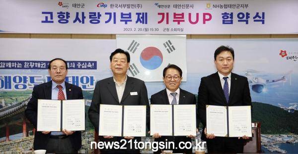 협약서에 따르면, 태안군·한국서부발전(주)·태안신문사·NH농협 태안군지부 등 4개 기관은 고향사랑기부제 ‘기부UP’ 달성을 위해 상호 긴밀한 협조체계를 구축할 예정이다.