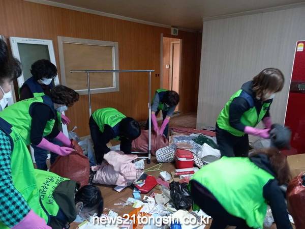 아산시 온양3동 행복키움추진단(공동단장 박충서, 김정자)이 지난 21일 저소득층 장애인 가구를 방문해 집 내부를 청소하는 주거환경 개선사업을 진행했다.