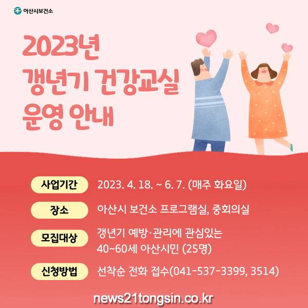 아산시(시장 박경귀)가 우울증과 스트레스, 안면홍조, 불면증, 어깨결림 등 갱년기 신체 변화로 인한 증상을 예방·관리하기 위해 운영하는 ‘갱년기 건강 교실’ 참가자를 다음 달 14일까지 모집한다.