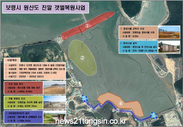 ▲ 사업계획도보령시는 해양수산부에서 주관한 2023년 갯벌복원사업 공모에 원산도 진말갯벌이 선정되어 국비 49억 원을 포함한 사업비 70억 원을 확보했다.