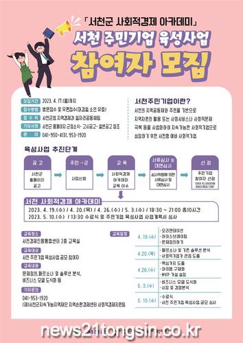 ▲ 서천군, 창업지원금 최대 1000만원 지원한다!(포스터)서천군이 오는 17일까지 사회적기업으로 원활한 진입을 위해 ‘서천군 주민기업 육성사업’ 참여자를 모집한다.