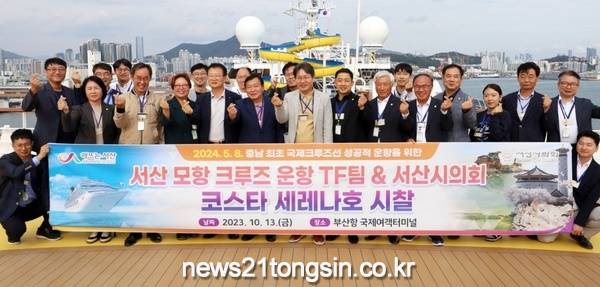 ▲ 13일 부산항에서 서산 모항 크루즈선 운항 TF팀과 서산시의원들이 코스타세레나호를 시찰하는 모습 충남 서산시는 13일 부산항에서 서산 모항 크루즈선 운항 TF팀과 서산시의회가 함께 ‘코스타세레나호