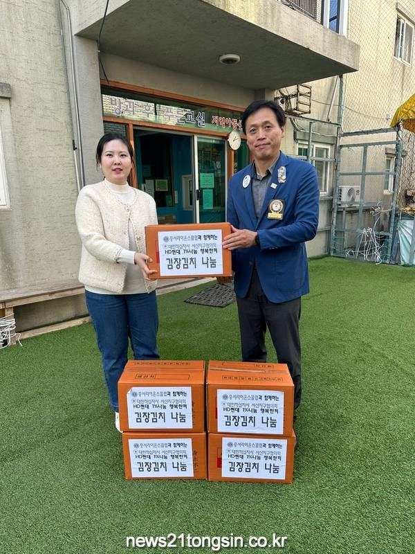 ▲ 방과후 푸른교실 지역아동센터에 김장나눔을 전하고있는 충서클럽(회장 이선호)이선호(32대회장)은 충서라이온스클럽은 순수한봉사를 목적으로하는 국제단체로써 78명의 회원이 하나가 되어 봉사가 필요한 곳이라면 어디든 찾아가 사랑의온정을 나누고 싶다고 말했다.