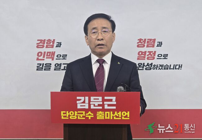 충북 단양군의 김문근 군수가 재선 도전을 공식 선언하며 본격적인 선거전에 돌입했다.김 군수는 27일 단양군청에서 기자회견을 열고 “추진 중인 주요 사업들이 대부분 마무리 단계에 접어든 만큼, 이제는 이를 완성해 군민께 실질적인 성과로 돌려드릴 시점”이라며 재선 의지를 밝혔다.그는 “민선 9기는 단순한 완성의 시간을 .