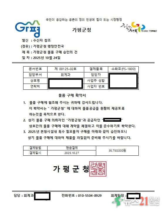 가평군은 최근 공무원을 사칭해 공사계약 및 공사용 자재 구매를 유도한 사기 사례가 발생함에 따라 군민들에게 각별한 주의를 당부했다.가평군에 따르면 지난 24일, 한 사기범이 군청 회계과 소속 주무관이라고 속이며 지역 내 업체에 전화를 걸어 “두 달 후 발주 예정인 공사를 맡을 수 있겠느냐”고 문의한 뒤, 업체 명함을 요구한 ...