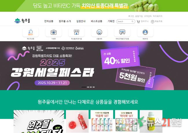 원주시 공식 인터넷 쇼핑몰 ‘원주몰(wonju-mall.co.kr)’이 10월 29일부터 11월 21일까지 ‘강원세일페스타 할인기획전’을 연다.행사 기간 매주 목요일(10월 30일, 11월 6일·13일·20일) 오전 10시에는 40% 할인쿠폰이 선착순으로 발급된다.쿠폰은 원주몰 회원이라면 누구나 받을 수 있으며, 입점한 모든 상품에 적용할 수 있다. 단...