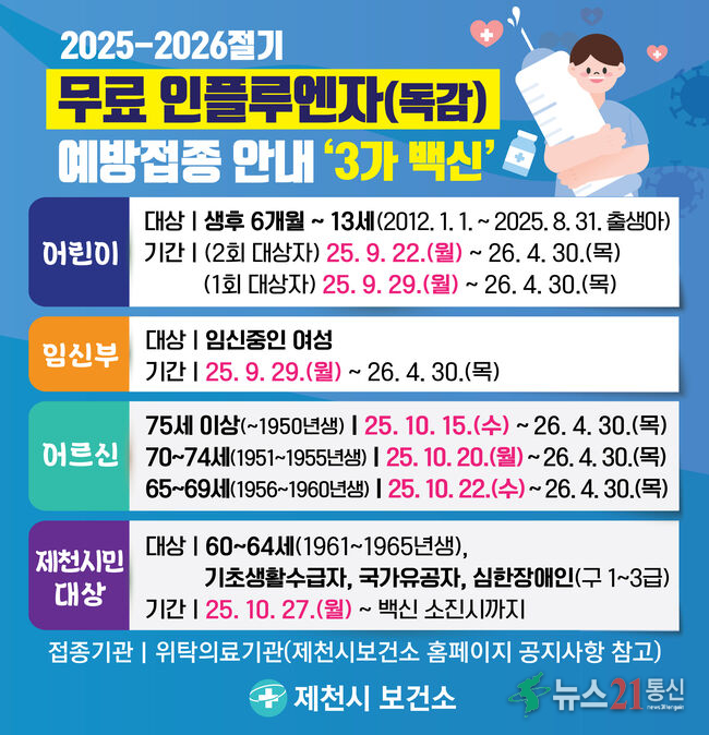 제천시보건소 관계자는 “대상자별 접종 일정을 반드시 확인하신 후 가까운 병·의원을 방문해 안전하게 인플루엔자 예방접종을 받으시길 바란다”고 당부했다.