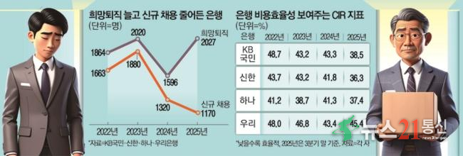 [뉴스21 통신=추현욱 ]작년 KB국민·신한·하나·우리은행 등 4대 은행의 신규 채용은 3년 연속 감소한 반면, 희망퇴직자는 5년 내 최대치를 기록한 것으로 나타났다. 디지털과 인공지능(AI) 시대를 맞아 은행들이 선제적으로 인건비를 감축하면서 미래를 대비하고 있는 것으로 풀이된다.지난 12일 금융권에 따르면 2025년 4대 은행에.