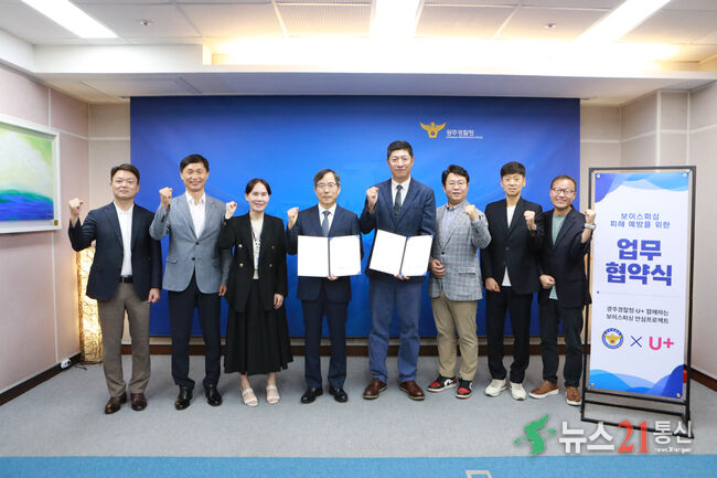 LG유플러스 업무협약 단체사진 (사진=광주경찰청제공)광주경찰청은 9월 25일 LG유플러스와 ‘보이스피싱 안심 프로젝트’ 협약을 체결하며, 보이스피싱 범죄 예방을 위한 다각적 협력 체계 구축에 나섰다. 이번 협약은 2025년 공공서비스 디자인 성과공유대회에서 국무총리상을 수상한 기존 모델의 성과를 바탕으로, 기술적·인적 협력을 강화해 보다 효과적인 대응 방안을 마련하기 위해 추진됐다.