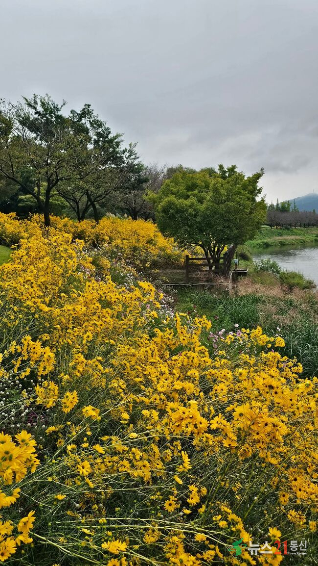 멀리 보이는 산과 도시의 풍경을 배경으로, 정원 속 꽃들은 계절의 변화를 가장 먼저 알리듯 활짝 피어나 있다. 초록빛 잔디 위에 놓인 꽃의 파도는 자연과 사람을 이어주는 다리처럼 느껴지며, 그 속을 거닐다 보면 일상의 무게가 잠시 내려앉고 마음이 환히 열리는 경험을 선사한다.