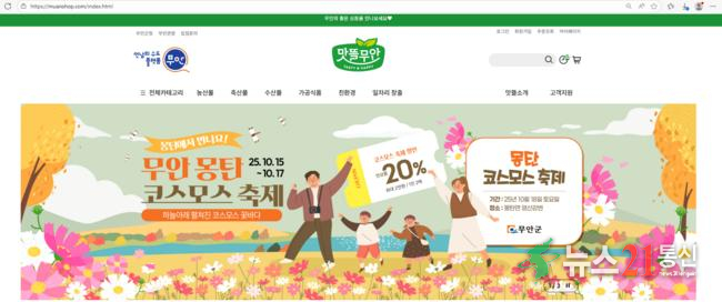 [뉴스21 통신=박철희 ] 전남 무안군(군수 김산)이 오는 15일부터 공식 쇼핑몰 ‘맛뜰무안몰’을 통해 소비자에게 다양한 혜택을 제공하는 10월 특별 할인 프로모션을 진행한다고 밝혔다.
