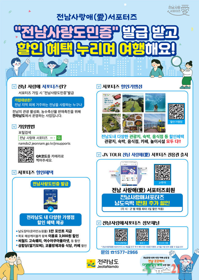 ‘전남 사랑애 서포터즈’는 전남 농특산물 소비 촉진과 관광 활성화를 목표로 운영되며, 가입자에게는 전남 도내 관광지, 숙박업소, 음식점, 전통시장 등 할인가맹점에서 할인 혜택을 받을 수 있는 ‘전남사랑도민증’이 발급된다.