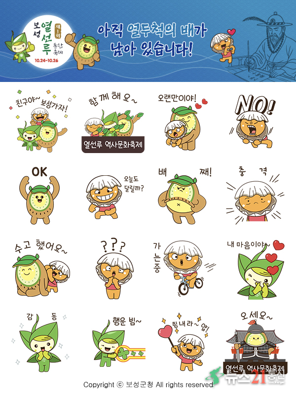 이번 이모티콘 배포는 오는 24일부터 3일간 열리는 ‘제1회 보성 열선루 이순신 역사문화축제’를 널리 알리기 위한 홍보 전략의 일환으로, 보성의 대표 특산물인 녹차, 꼬막, 키위를 귀엽고 익살스럽게 표현한 캐릭터들이 눈길을 끈다.
