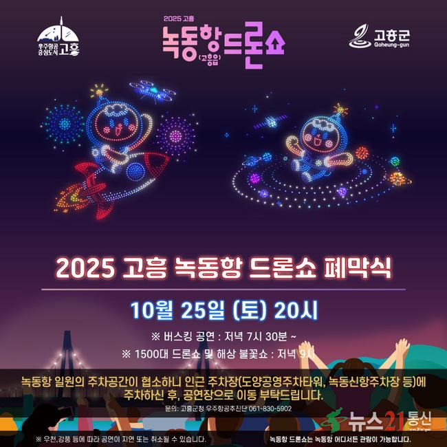 고흥군(군수 공영민)은 오는 10월 25일 저녁 8시, 녹동항 바다정원 일원에서 ‘2025 녹동항 드론쇼 폐막식’을 개최한다고 밝혔다.