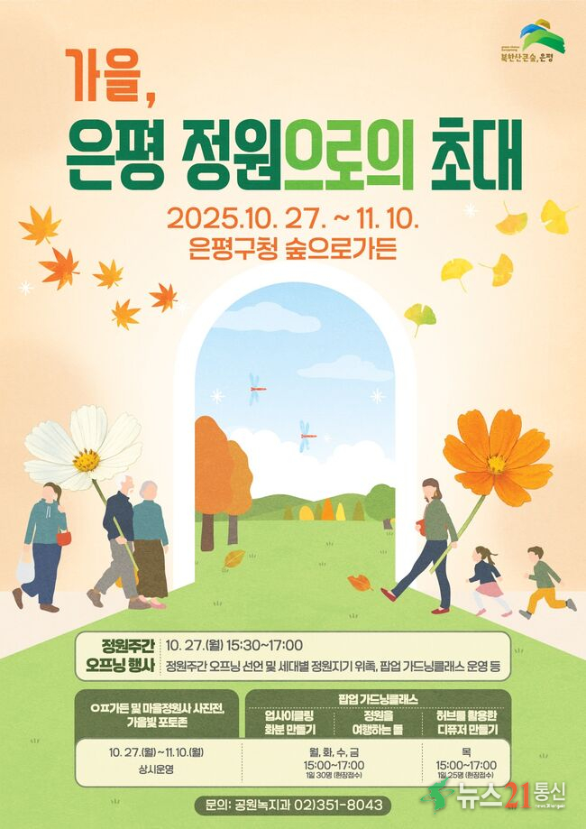 서울 은평구(구청장 김미경)는 오는 27일 은평구청 앞 숲으로가든에서 ‘가을, 은평 정원으로의 초대’를 주제로 정원주간 개막식을 연다고 밝혔다. 이번 행사를 시작으로 10월 27일부터 11월 10일까지 2주간 ‘정원문화 확산 주간’이 이어진다.