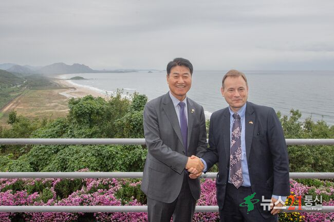 평화 경제 거점 도시 강원 고성군(군수 함명준)은 지난 10월 15일 게오르크 빌프리드 슈미트(Georg Wilfried Schmidt) 주한 독일대사가 고성군을 방문했다고 밝혔다. 이번 방문은 지난 5월 ‘2025 유럽데이(Europe Day)’ 행사에서 함명준 군수와의 첫 만남 이후 두 번째 교류로, 평화와 통일의 상징 도시로 자리 잡은 고성군과 독일 간 협력관계가 한층 강화되는 계기가 됐다.