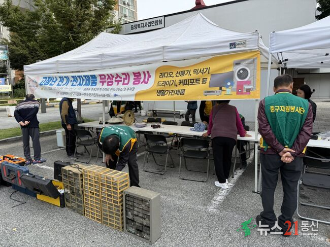 대전 중구(구청장 김제선)는 21일 중촌주공2단지아파트에서 중구 자원봉사센터(센터장 김진화) 주관으로 전자제품 무료 수리 봉사활동을 진행했다고 밝혔다.
