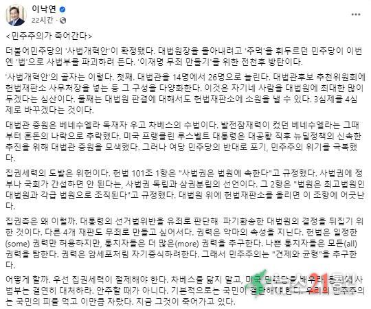 이낙연 새미래민주당 상임고문(전 국무총리)이 더불어민주당이 추진 중인 사법개혁안을 향해 “이재명 대통령의 무죄를 만들기 위한 전천후 방탄 입법”이라며 강도 높은 비판을 쏟아냈다.