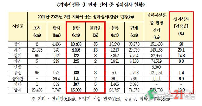 시설물별로는 상수관(3만273㎞)과 하수관(2만9,939㎞)의 검증률이 각각 20% 안팎에 머물렀고, 전기(14.3%), 가스(8.3%), 통신(1.4%) 시설은 더 낮았다. 특히 상수관은 불탐 비율이 35%에 달해, 전체 시설 중 가장 위험도가 높았다.