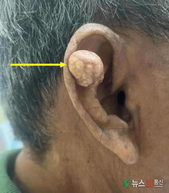 검사 결과 A씨는 고요산혈증 상태였으며, 왼쪽 귓바퀴에는 진주빛 흰색의 약 2㎝ 크기 결절이, 오른쪽에는 유사한 결절 두 개가 발견됐다. 절제 생검 조직검사에서 단백질 대사 산물인 요산 결정이 관찰되면서 ‘이개결절성 통풍(auricular tophi)’으로 확진됐다.