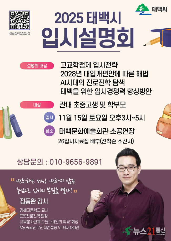 태백시(시장 이상호)는 오는 11월 15일 오후 3시부터 5시까지, 「2025 태백시 입시설명회」를 개최한다고 밝혔다.