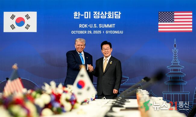 지난 10월 29일 이재명 대통령과 도널드 트럼프 미국 대통령이 경북 경주박물관에서 열린 한미 정상회담에 앞서 악수하고 있다. 대통령실 제공