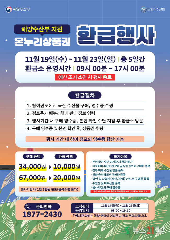 정해민 경제진흥과장은 “이번 환급행사가 상인들의 매출 회복에 도움이 되고 소비자들에게 실질적 혜택이 되길 바란다”며 “많은 군민과 관광객들이 행사 기간 서천특화시장을 방문해 신선한 제철 수산물을 합리적 가격에 구매하시길 바란다”고 말했다.