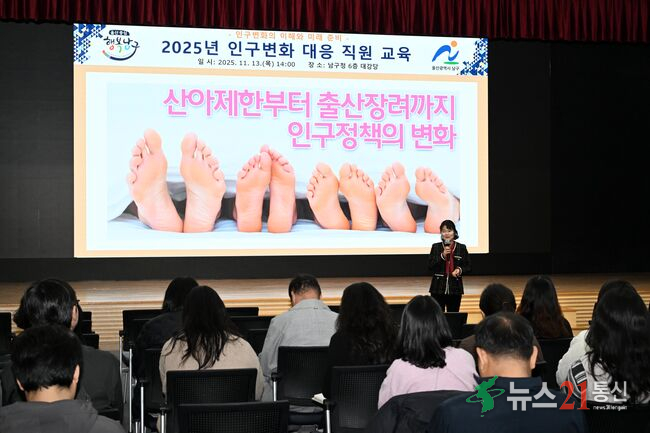 울산 남구(구청장 서동욱)는 13일 남구청 6층 대강당에서 직원 150여 명을 대상으로 인구 감수성 제고를 위한 ‘인구변화 대응 역량 강화 교육’을 실시했다.