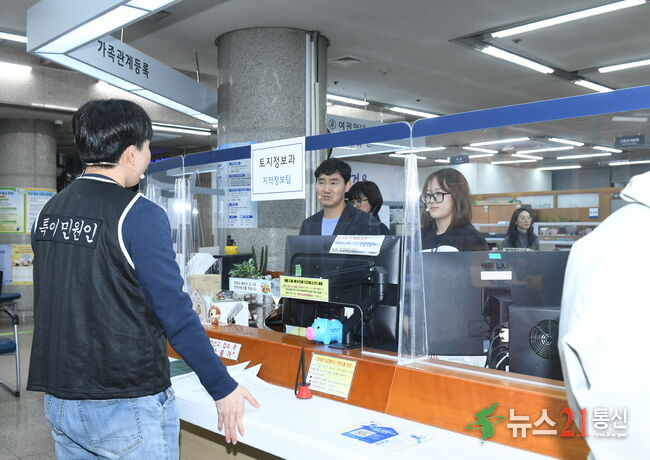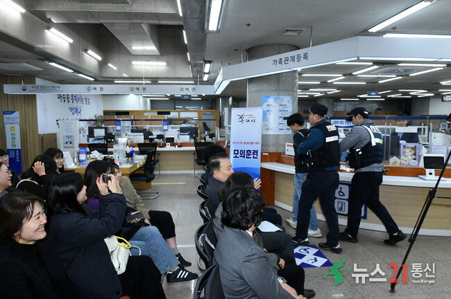 훈련은 ‘민원인이 부모의 부동산 정보를 요구하며 폭언과 폭행을 가하는 상황’을 가정해 진행됐다. 종합민원실 직원들은 비상 대응 체계에서 각자 맡은 역할을 성실히 수행하며 긴급상황에서 신속하고 효과적인 현장 대응 능력을 점검했다.
