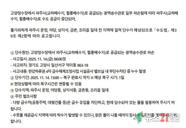 송수관로 복구를 위해 수도 공급을 중단하면서, 현재 파주 운정동과 야당동, 상지석동, 금촌동, 교하동, 조리읍 일대 수돗물 공급이 끊긴 상태이다.