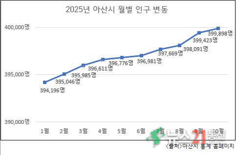 10월 말 기준 아산시 인구수는 약 39만 9,898명으로, 102명이 더 늘면 ‘인구 40만’ 고지를 넘게 된다. 최근 매달 500~600명가량이 꾸준히 늘어나는 추세를 감안하면, 이달 중으로 40만 명 돌파가 확실시된다.