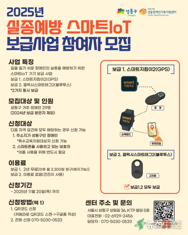 '스마트 IoT 보급사업' 참여 신청은 오는 11월 20일까지 가능하며, ‘성동장애인가족지원센터’ 누리집(홈페이지) 또는 홍보 포스터 내 정보무늬(QR코드)를 통해 신청하면 된다.