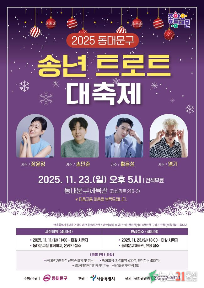 동대문구가 주최·주관하고 서울시가 후원하는 이번 축제에는 트로트 스타 장윤정, 송민준, 황윤성, 영기가 무대에 올라 겨울밤을 뜨겁게 달굴 예정이다.
