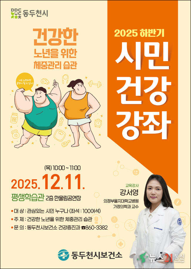 동두천시(시장 박형덕)는 오는 12월 11일 오전 10시, 평생학습관 2층 한울림 공연장에서 ‘건강한 노년을 위한 체중관리 습관’을 주제로 시민건강강좌를 운영할 예정이라고 밝혔다.