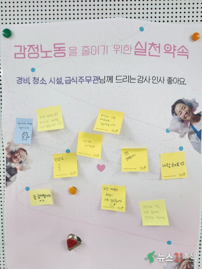 강동고는 인공지능(AI)을 기반으로 자체 제작한 영상을 중앙현관 복도에 상시 상영하고, 감정노동 줄이기 실천 약속 게시판을 운영해 소통과 배려의 메시지를 전했다. 미포초는 급식실, 화장실 등 현장 근무지에 감정노동 보호 띠 광고(배너)를 설치해 학교 구성원 간 공감과 존중을 바탕으로 한 건강한 근무 문화 조성에 앞장섰다.