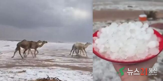끝없이 펼쳐진 모래 언덕이 순식간에 새하얀 얼음으로 뒤덮였다. 알프스를 연상케 하는 풍경이지만, 실제로는 사우디 메디나 인근의 사막 지역이다.