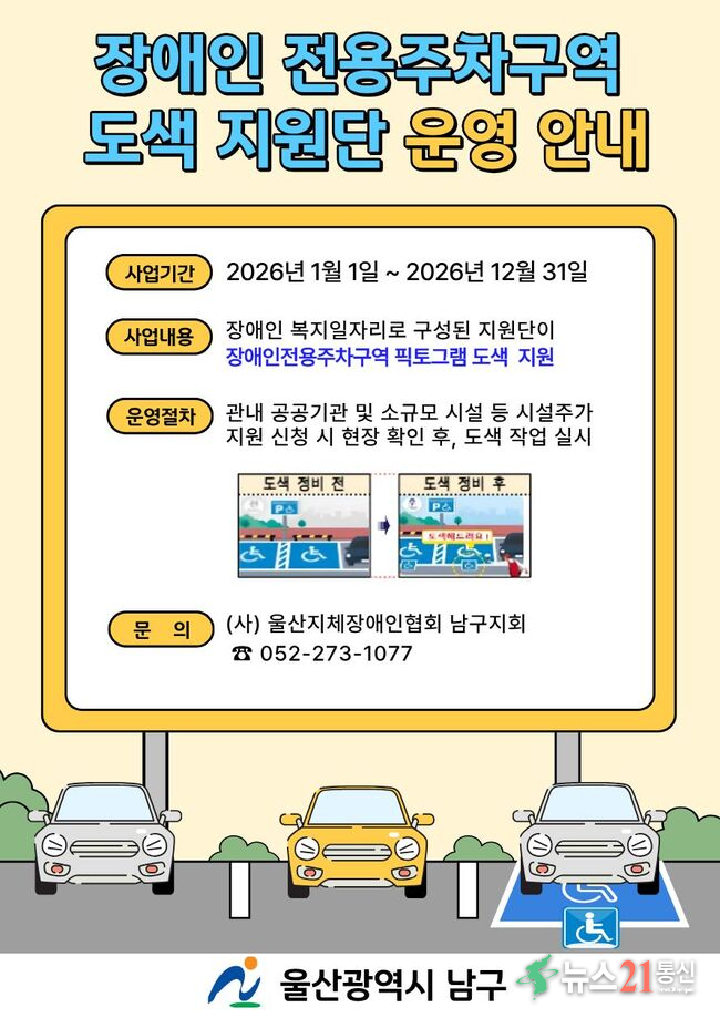 [뉴스21 통신=최세영 ] 울산 남구(구청장 서동욱)는 장애인이 직접 장애인전용주차구역을 정비하는 ‘장애인전용주차구역 도색 지원단’을 올해부터 운영한다. 이번 사업은 전국 최초로 장애인일자리와 장애인전용주차구역 정비를 결합한 남구형 특화 일자리 모델로 기존의 단순·보조적 장애인일자리에서 벗어나 장애인이 ...