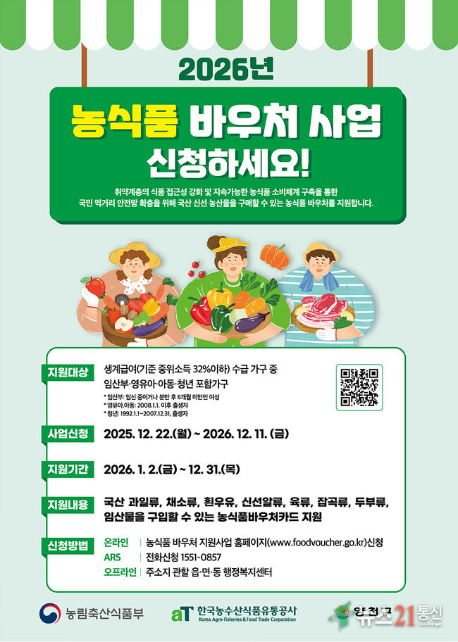 양천구(구청장 이기재)는 계속되는 물가 상승으로 저소득층의 식료품비 부담이 커진 가운데 취약계층의 균형 잡힌 식생활을 지원하기 위해 ‘농식품 바우처’ 지원을 확대한다고 20일 밝혔다. 농식품 바우처 지원사업은 생계급여 수급 가구를 대상으로 국산 신선 농식품을 구매할 수 있는 바우처를 지원하는 제도로, 취약계층의 영양 ...