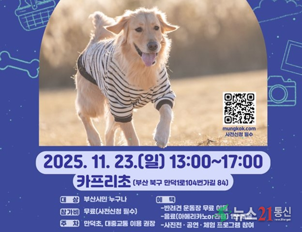 □ 부산시(시장 박형준)는 오는 11월 23일 오후 1시부터 5시까지 카프리초(북구 만덕동 소재) 내 반려견 운동장에서 「댕댕 선데이(반려동물 동반 피크닉 체험 행사)」를 개최한다고 밝혔다.