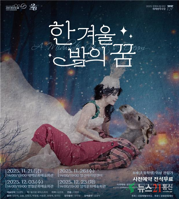 □ 강원특별자치도(도지사 김진태)는 문화 소외지역인 폐광지역 주민의 문화예술 향유 기회를 확대하고, 청소년 문화 격차를 해소하기 위해 2025년 폐광지역 찾아가는 문화예술공연 연극 「한 겨울밤의 꿈」을 폐광지역 4개 시군에서 총 8회 개최한다고 밝혔다.