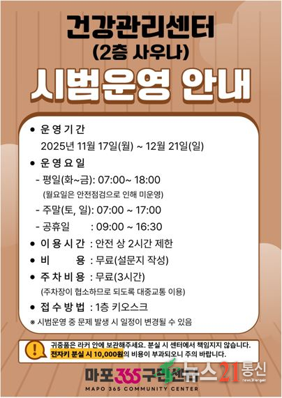 마포구(구청장 박강수)는 마포365구민센터 내 ‘건강관리센터(남·녀 사우나)’ 정식 개관에 앞서 운영 안정성을 확보하고, 이용객 의견을 수렴하기 위해 2025년 12월 21일까지 시범운영을 시작한다.