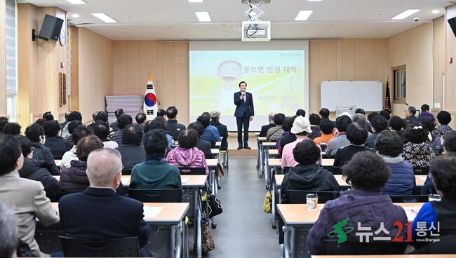 박천동 북구청장이 19일 시니어행복나눔센터에서 '웃으면 인생 대박'을 주제로 특강을 진행하고 어르신들과 소통의 시간을 가졌다.