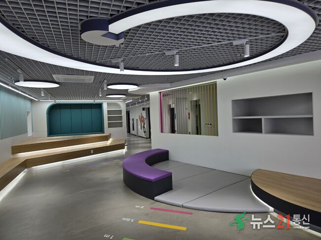 2층은 청소년이 자유롭게 휴식하며 친구들과 시간을 보내고 스트레스를 날릴 수 있는 뒹굴라운지, 댄스실, 밴드실, 코인노래방, 모임룸 등으로 구성했다.