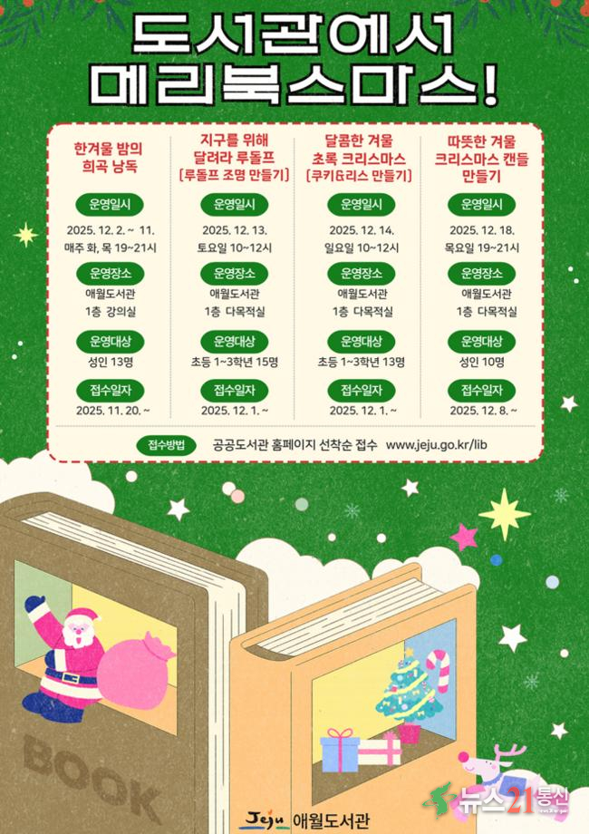 애월도서관은 겨울을 맞아 지역 주민들이 따뜻하고 풍요로운 연말을 보낼 수 있도록 12월 2일부터 18일까지 ‘도서관에서 메리북스마스!’ 연말 특별 프로그램을 운영한다.