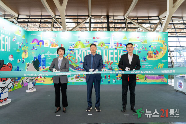 사진=한국공항공사, 지난 14일 중국 상해 푸동공항에서 열린 ‘Korea Week’ 한국 관광 홍보관 오픈 행사에서 손종하 한국공항공사 운영본부장(가운데), 상해문화관광국 부국장 WANG Zhihua(오른쪽), 상해공항그룹 부사장(ZHAO Haibo)이 기념 촬영을 하고 있다.