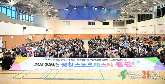 북구체육회는 22일 오토밸리복지센터 체육관에서 회원단체 스포츠 경연대회인 '함께하는 생활스포츠페스타, 뿜뿜'을 열었다. 개회식에서 박천동 북구청장과 김상태 북구의회 의장, 김태민 북구체육회장 등이 회원단체 참가자들과 기념촬영을 하고 있다.