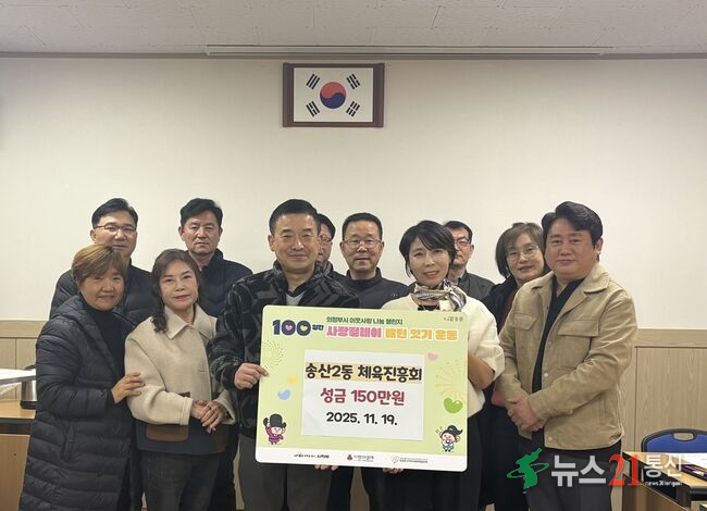 의정부시 송산2동주민센터(동장 황보경)는 11월 19일 송산2동 체육진흥회(회장 홍만호)가 ‘100일간 사랑릴레이 배턴 잇기’에 동참해 지역 내 어려운 이웃을 위한 성금 150만 원을 기탁했다고 밝혔다.