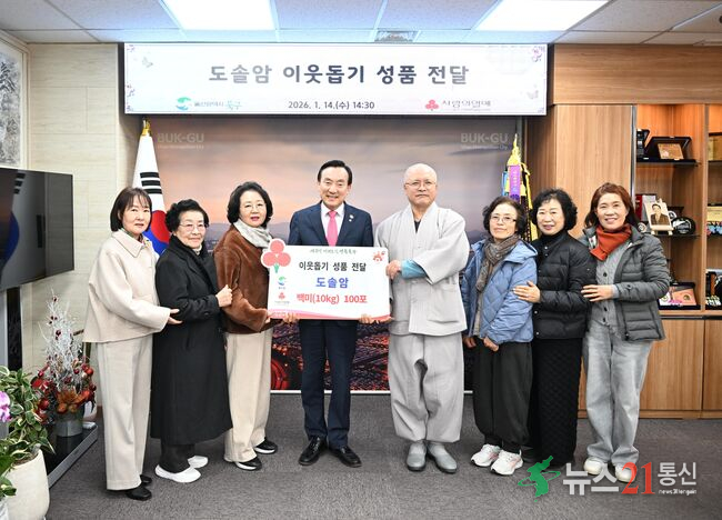 [뉴스21 통신=최병호 ]*사진출처-울산북구청도솔암 주지 덕인스님과 신도들은 14일 북구청장실에서 북구 지역 노인복지시설 4곳(북구노인복지관, 시립제2노인복지관, 울산현대요양원, 북구실버케어센터)에 쌀 10kg 100포를 전달했다.